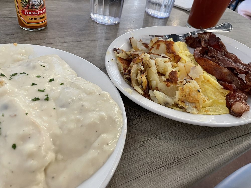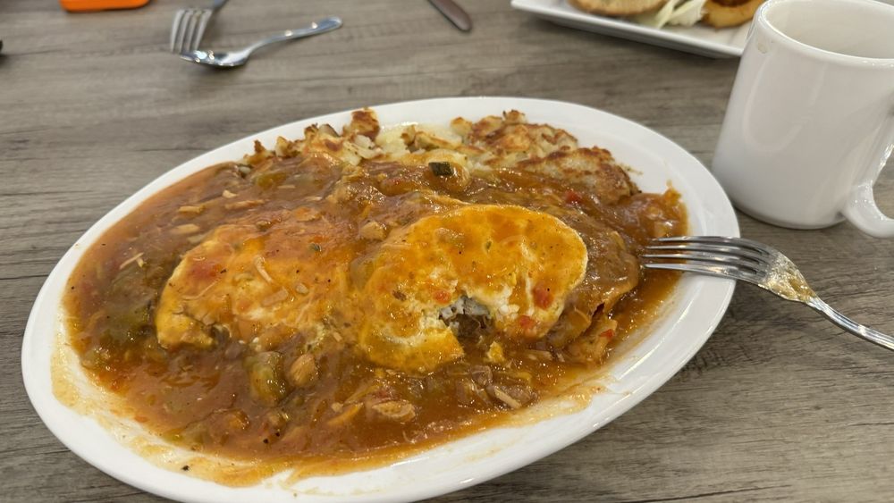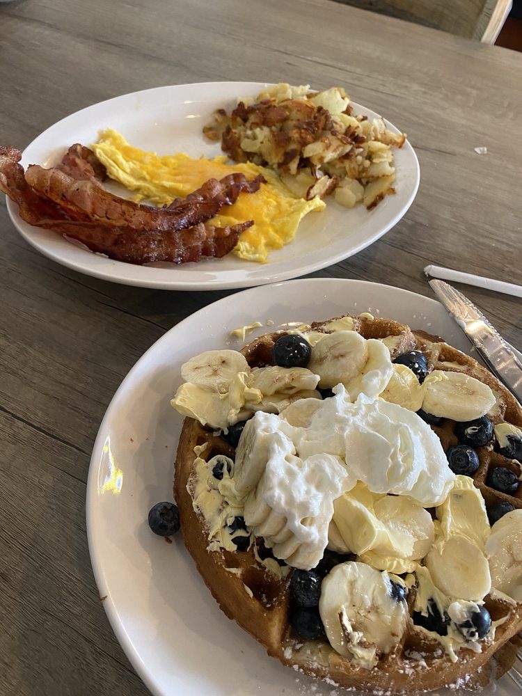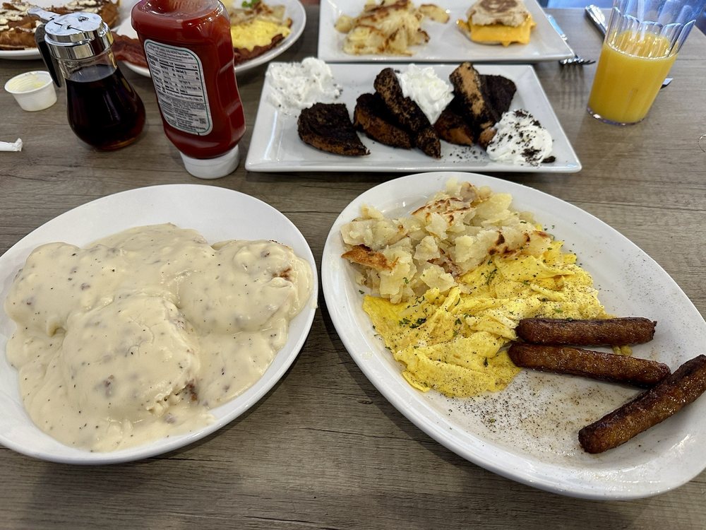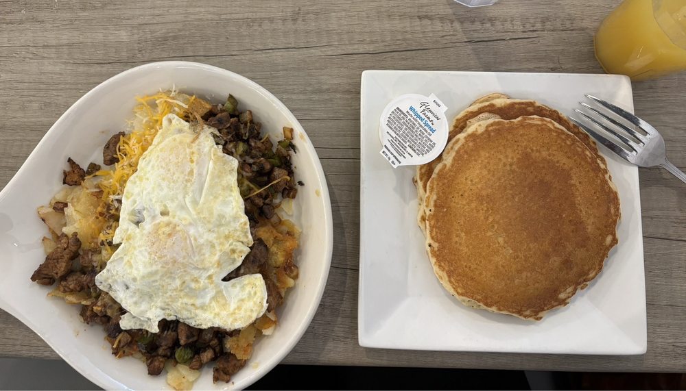 Customer reviews rave about the friendly service, generous portion sizes, and diverse menu options. From fluffy pancakes to savory bacon and eggs, every dish is meticulously prepared to perfection. The vibrant ambiance and efficient staff create a comfortable dining experience, whether you choose to sit indoors or on the patio.